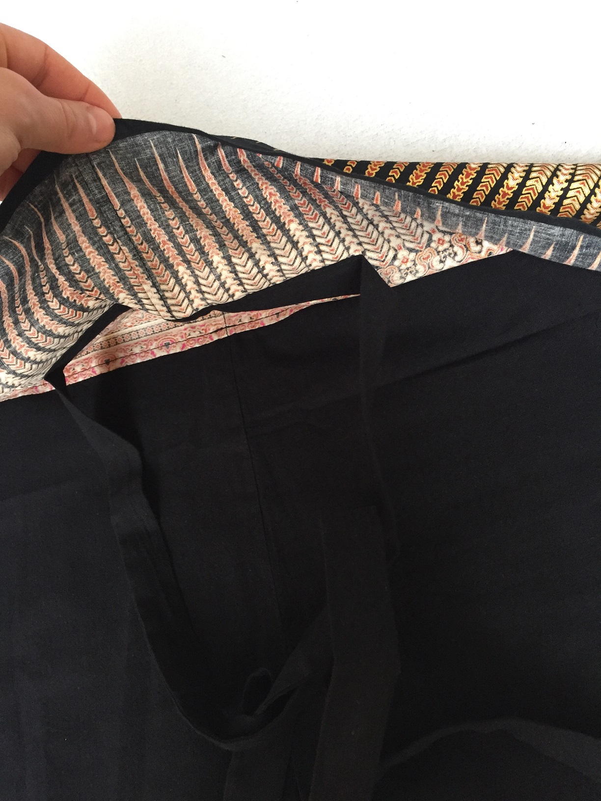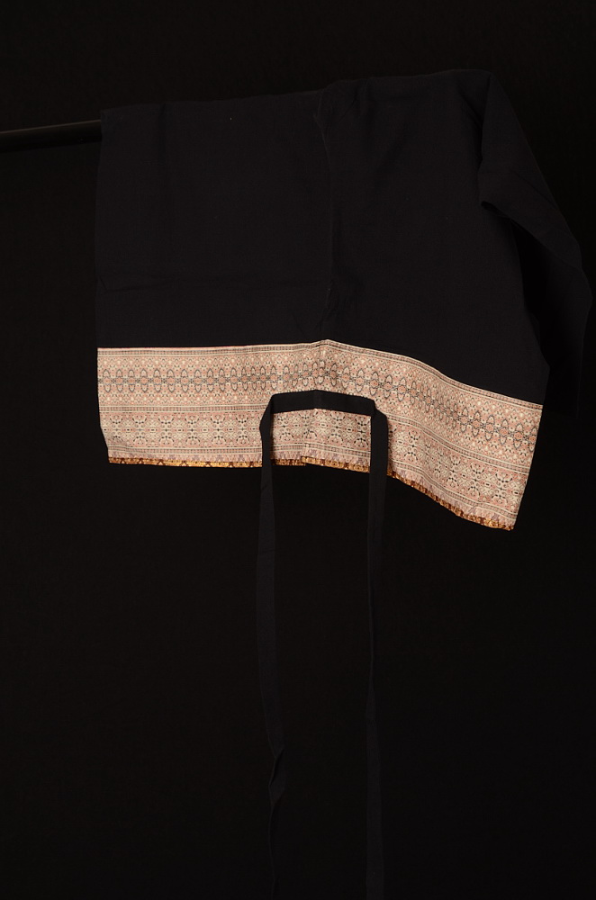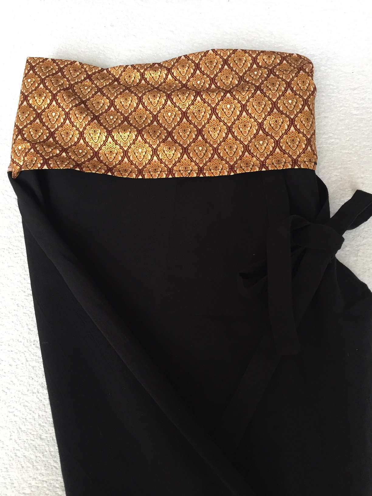 Velmi příjemné elastické kalhoty v černé barvě. Ideální pro maséry. Díky výšivce vypadají elegantně, navíc jsou funkční. V pase širší pruh látky k zavazování, viz foto. 3/4 střih.